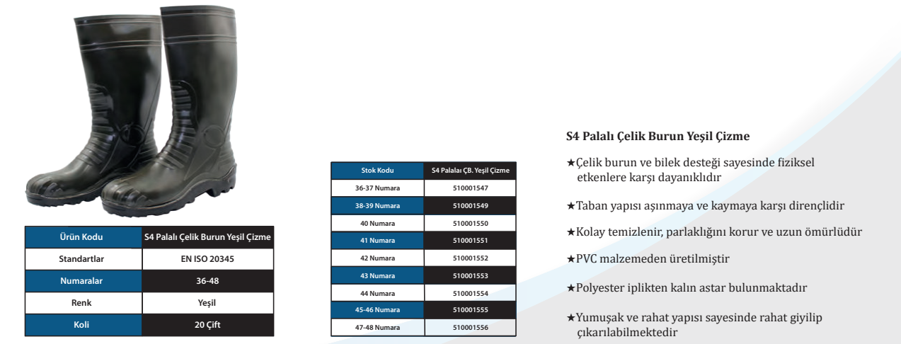 Çelik Burun Emniyet Çizmesi (S4) – Palalı, iş güvenliği standartlarına uygun, dayanıklı ve koruyucu bir modeldir. Çelik burun yapısı sayesinde darbelerden ayağı korur. S4 sertifikası ile su geçirmez özelliğe sahip olup özellikle inşaat, sanayi ve tarım sektörlerinde güvenli kullanım sunar.