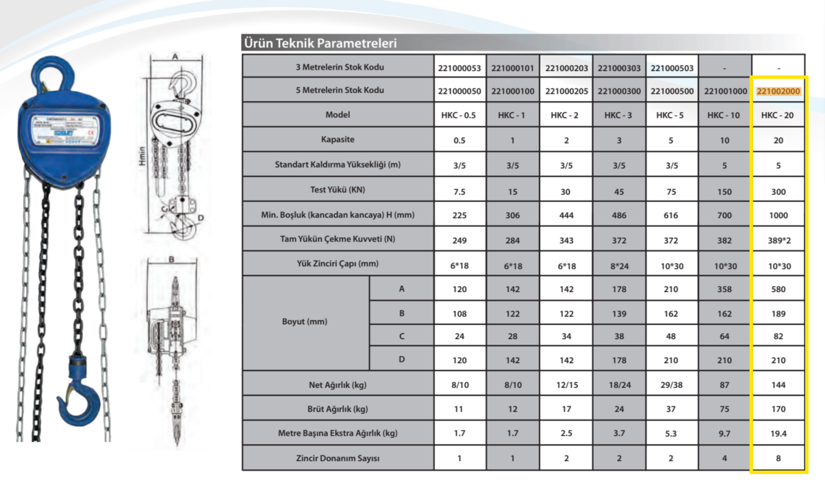 20 ton taşıma kapasitesi, en zorlu sanayi ve şantiye koşullarında dahi güvenilir performans sağlar. 5 metre yüksek mukavemetli çelik zinciri, geniş çalışma alanlarında esnek kullanım sunarken; HS-S tipi güçlendirilmiş üçgen gövde, yük altında maksimum denge ve uzun ömürlü dayanıklılık sağlar.