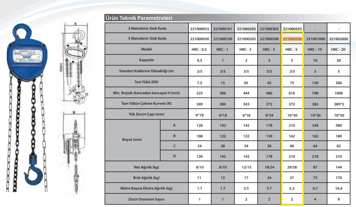 5 ton taşıma kapasitesi, ağır sanayi ve endüstriyel uygulamalarda yüksek performans sunar. 5 metre zincir uzunluğu, farklı yüksekliklerde rahat kullanım sağlarken HS-S tipi üçgen gövde yapısı, yük altında maksimum denge ve dayanıklılık kazandırır.