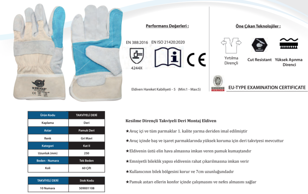 Hegi CE/SG-3/DP Yarma Deri İş Eldiveni, zorlu çalışma koşullarına uygun olarak üretilmiştir. Dayanıklı yarma deri malzemesi, sürtünme, darbe ve aşınmalara karşı yüksek koruma sağlar. İnşaat, sanayi, montaj ve kaynak işleri için ideal bir seçimdir.