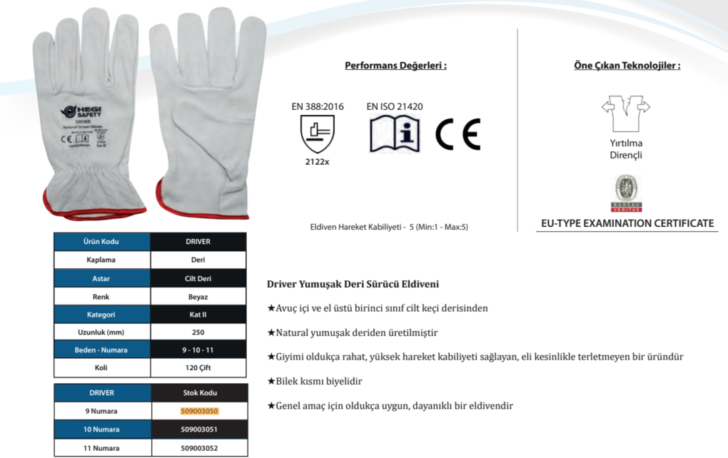 Hegi DR01-B Sürücü Eldiveni, yüksek kaliteli yumuşak deri yapısıyla kullanıcıya hem konfor hem de dayanıklılık sağlar. Özellikle sürücüler, montaj işleri ve hafif sanayi alanlarında tercih edilen bu eldiven, esnek yapısı sayesinde rahat bir kullanım sunar.