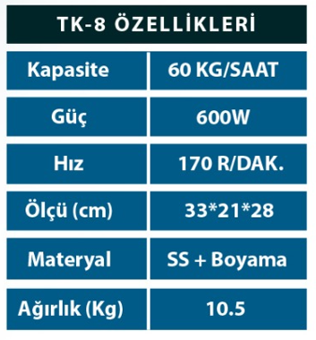 Kompakt yapısı ile mutfakta az yer kaplar, kolay sökülüp takılabilen parçaları sayesinde temizlik işlemleri zahmetsizdir. Ev kullanıcıları için ideal bir elektrikli kıyma makinesidir.